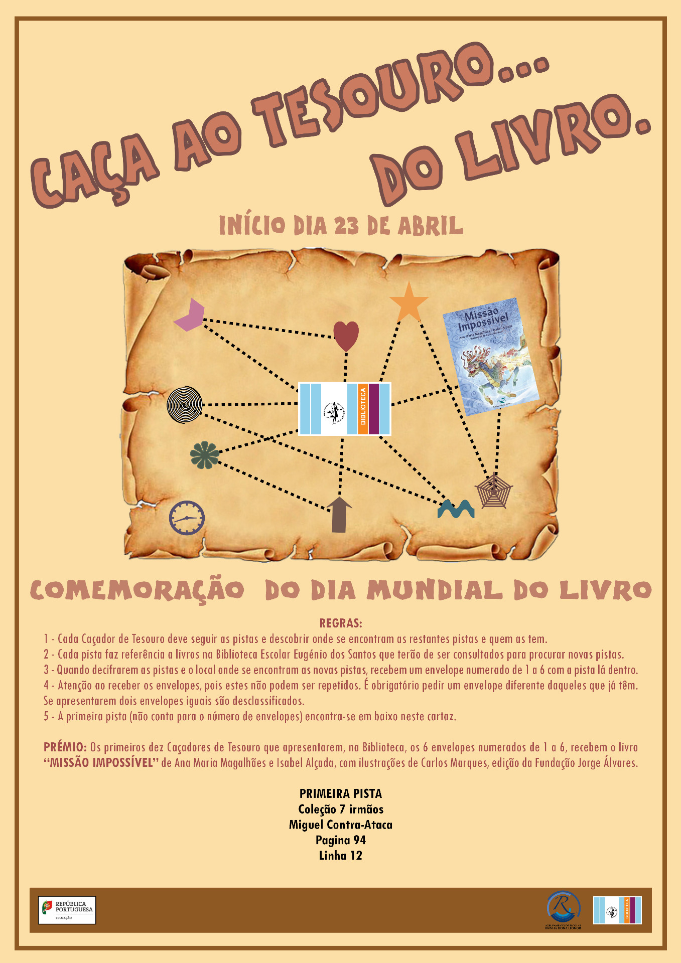 PRÉMIO: Os primeiros dez Caçadores de Tesouro que apresentarem, na Biblioteca, os 6 envelopes numerados de 1 a 6, recebem o livro "MISSÃO IMPOSSÍVEL" de Ana Maria Magalhães e Isabel Alçada, com ilustrações de Carlos Marques, edição da Fundação Jorge Álvares.